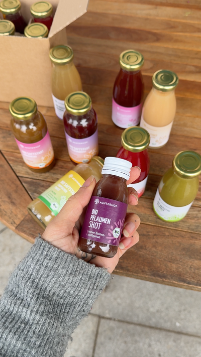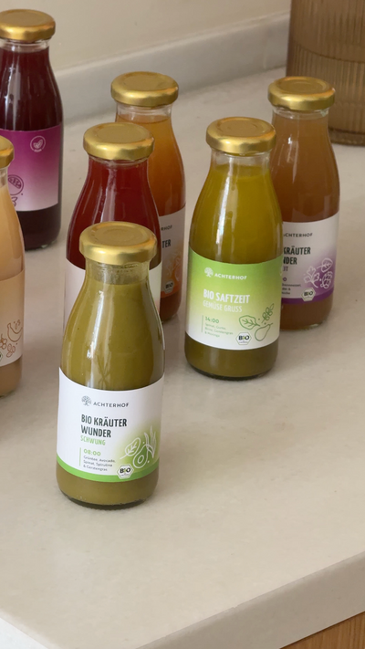Zutaten: 40 % Apfelsaft* aus Apfelsaftkonzentrat*, 30 % Topinambursaft* aus Topinambursaftkonzentrat* (milchsauer vergoren), 20 % Hagebuttensaft* aus Hagebuttensaftkonzentrat*, 9,5 % Karottensaft*, Zitronensaft*