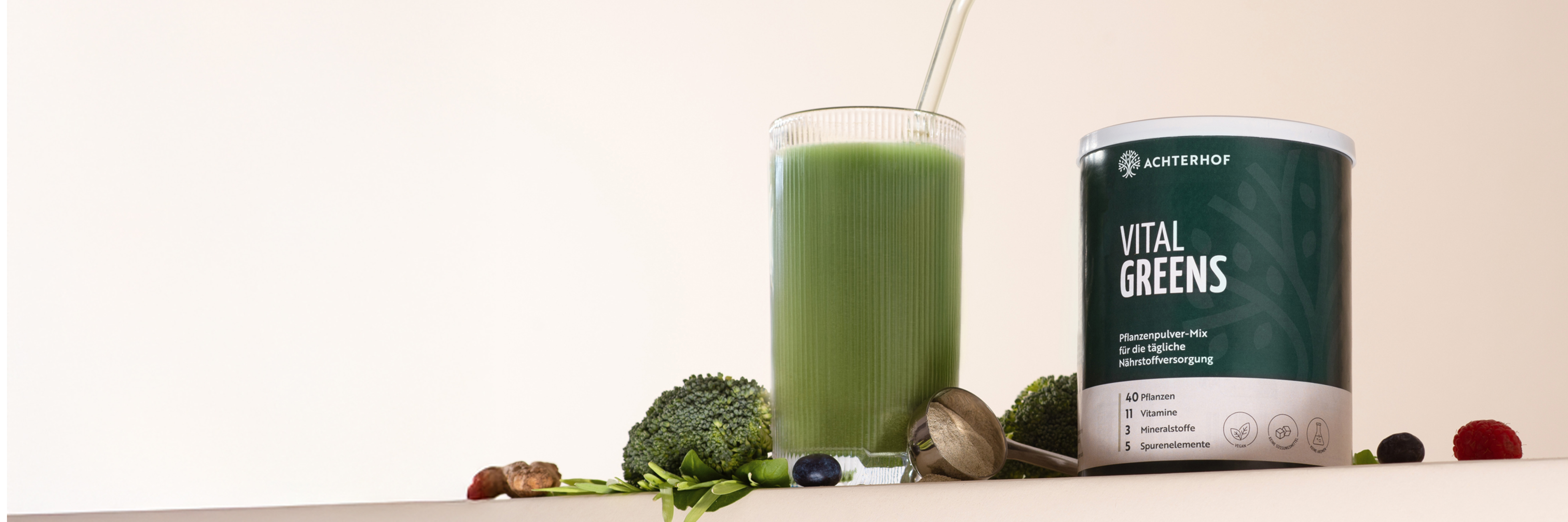 Mit Vital Greens bündeln wir unser Wissen in einem Löffel: sorgfältig ausgewählte Pflanzen, Vitamine und Mineralstoffe – ganz ohne künstliche Zusätze. Natürlich, ehrlich und so, wie wir es selbst täglich trinken.
