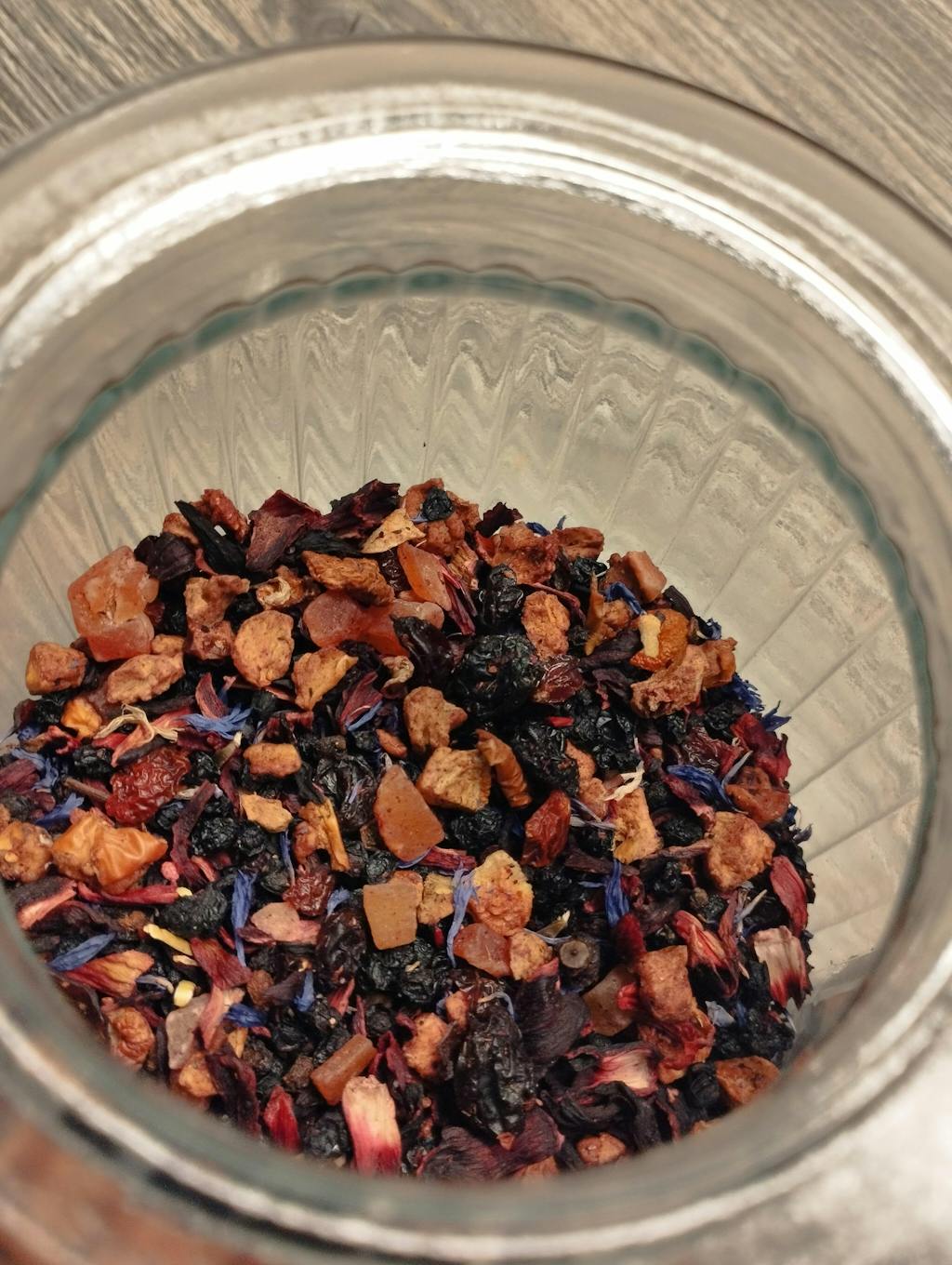 • Mit Fliederbeeren, Hibiskusblüten, Korinthen, Papayawürfeln, Apfelstücken, gefriergetrockneten Erdbeerstücken für ein besonderes fruchtiges Aroma
